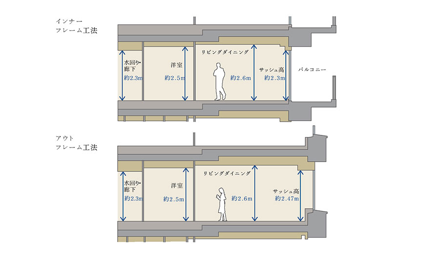 パノラマの眺望を取り込み、広がりを感じる伸びやかな居住空間をかなえるために、リビング・ダイニングには約2.6mの天井高が確保されています。さらにバルコニー側の柱梁はインナーフレームとアウトフレームを組み合わせることにより、中住戸で約2.3m※、コーナー住戸で約2.47m※のサッシュ高が実現されています。窓面をできるだけ大きくすることにより開放感あふれる室内空間をかなえています。